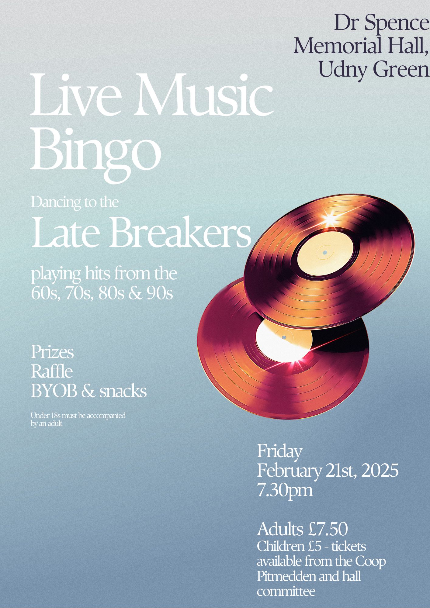 Music will be provided by the Late Breakers who play cover versions of well known hits from the 60s onwards.